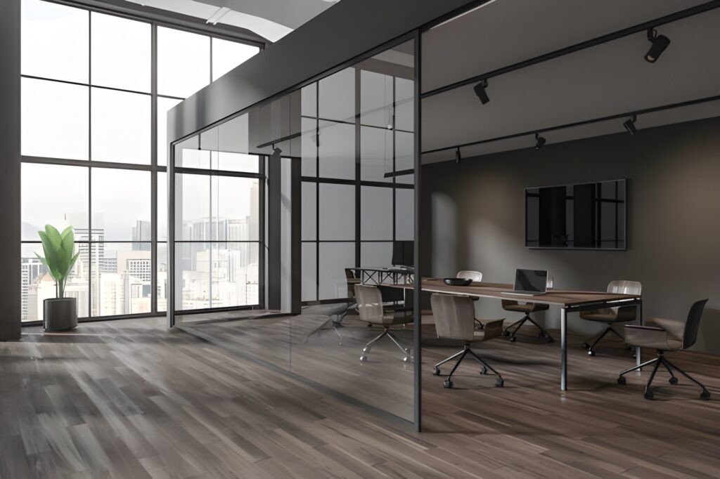 Modern partitions and glass walls for privacy and open-space balance in commercial and residential areas.