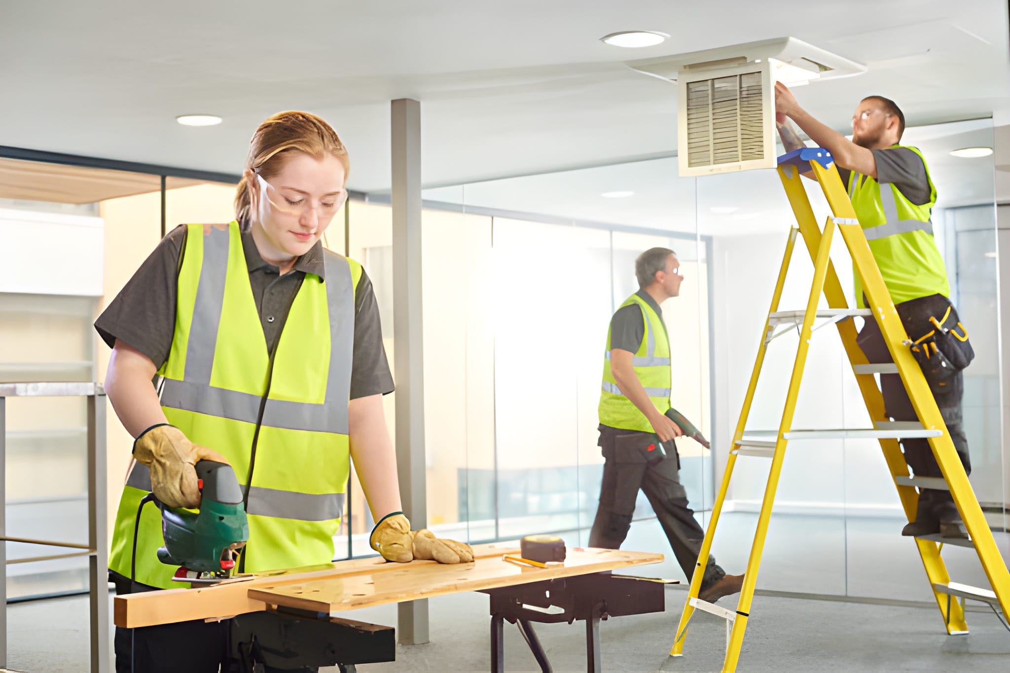 Complete office setup including partitions, ceilings, flooring, lighting, and furniture installation.